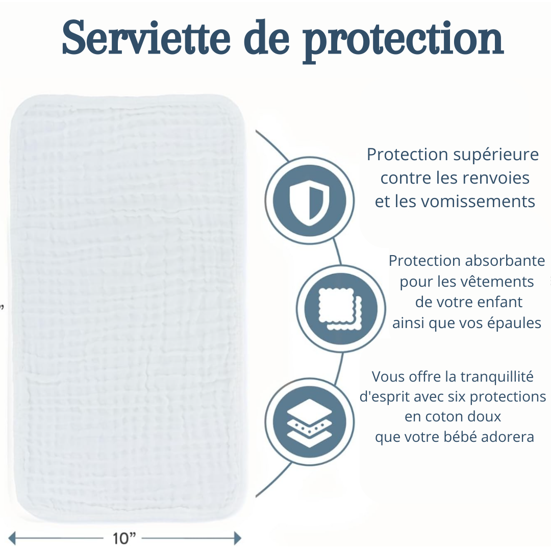 Nos serviettes de protection en coton offrent une absorption maximale pour prévenir efficacement les taches de vomi et de régurgitation de bébé. Le coton doux et absorbant assure une protection optimale des vêtements tout en restant confortable pour bébé.